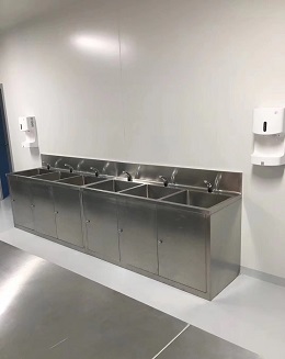 感應(yīng)洗手池為手術(shù)醫(yī)務(wù)人員洗手專用設(shè)備,采用人體感應(yīng)自動(dòng)給水,因此無(wú)需使用人員觸摸,保證清潔,流量500l/h,采用0.1um超濾膜,可將毒病菌全部過(guò)濾掉,同時(shí)采用雙柱超濾組件,具備反充技術(shù),可長(zhǎng)期使用。不銹鋼洗手池采用進(jìn)口優(yōu)質(zhì)304不銹鋼板制造而成,板材厚度1.5mm,不銹鋼洗手池池體采用一體式?jīng)_壓技術(shù),不銹鋼刷手池池體采用弧形結(jié)構(gòu),靜音防濺水,能有效防止誰(shuí)濺到洗手池外,洗手池可選裝自動(dòng)感應(yīng)水龍頭,腳踏式開關(guān),膝觸式開關(guān),自動(dòng)給皂機(jī),給刷器,熱水器,照明燈,鏡子及納米過(guò)濾膜的 設(shè)備。
